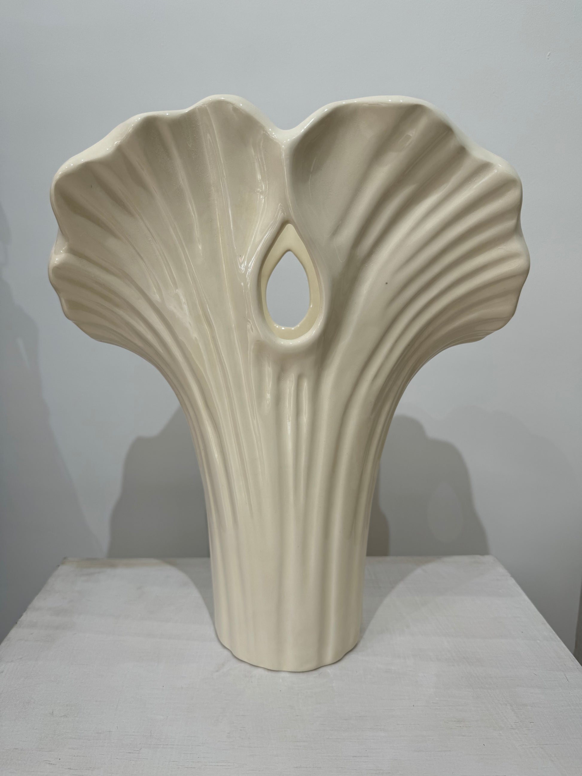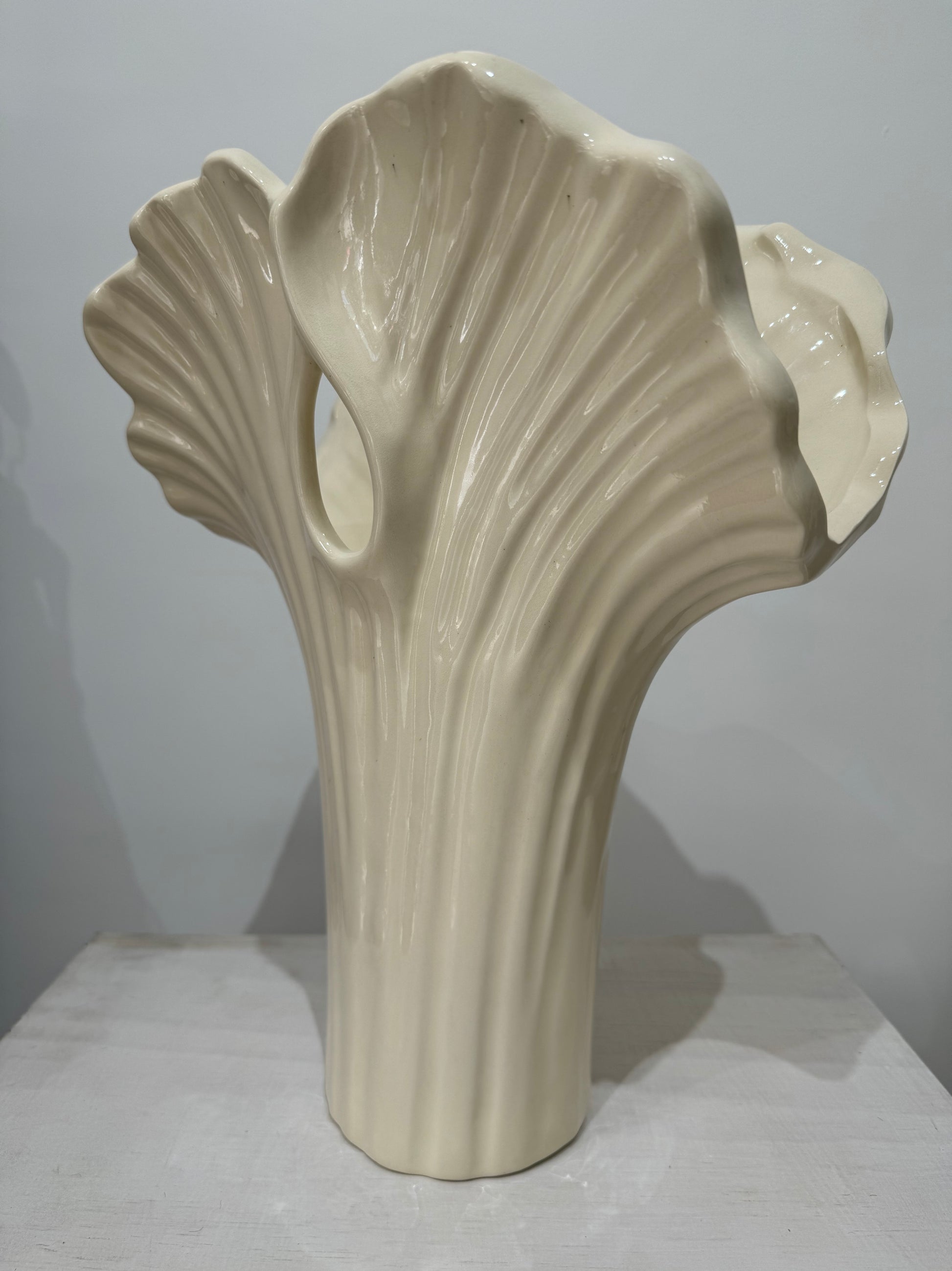 Este florero es una pieza única que fusiona la naturaleza con el diseño vintage. Inspirado en la delicada y distintiva forma de la flor y hoja) del ginkgo, su silueta presenta curvas suaves y líneas en abanico que evocan elegancia orgánica. Está elaborado en cerámica, con un acabado de vidriado crudo, lo que le otorga una textura brillosa aportando una sensación artesanal y atemporal.