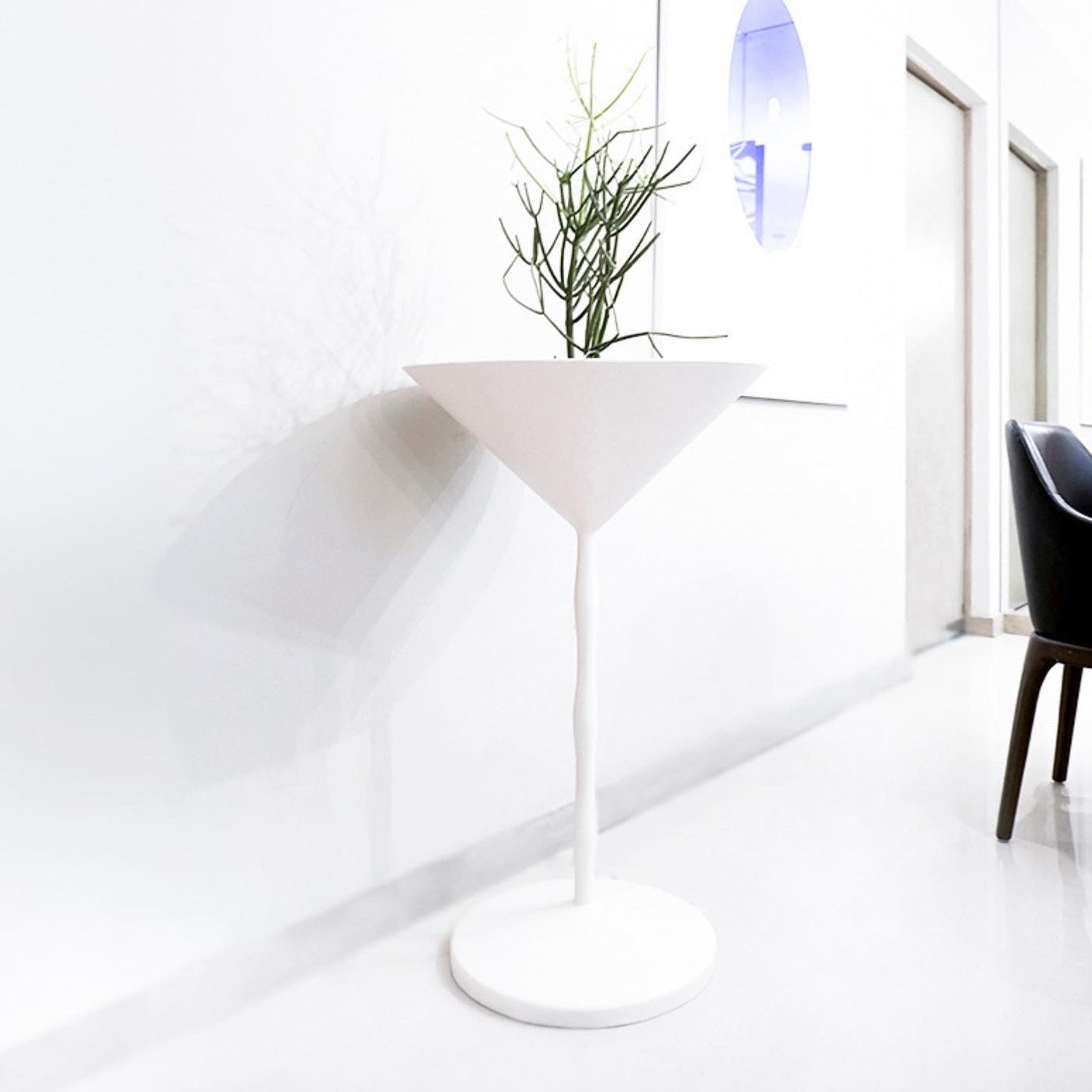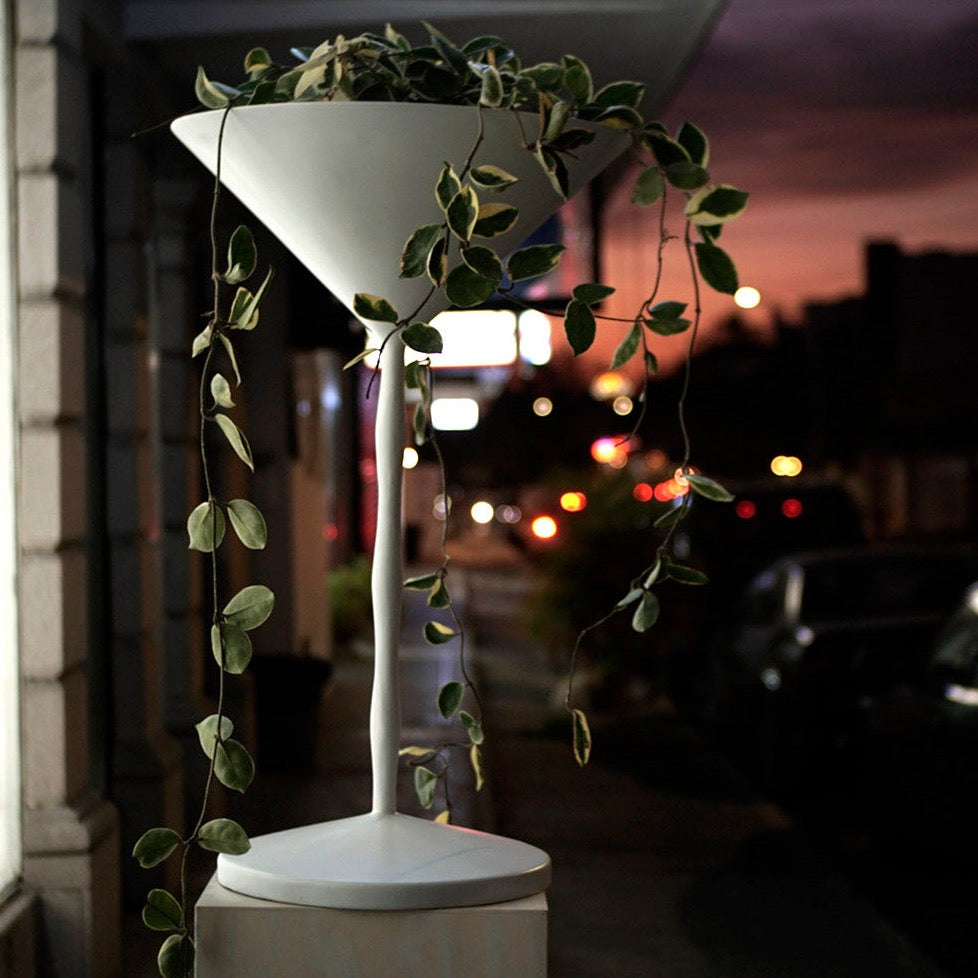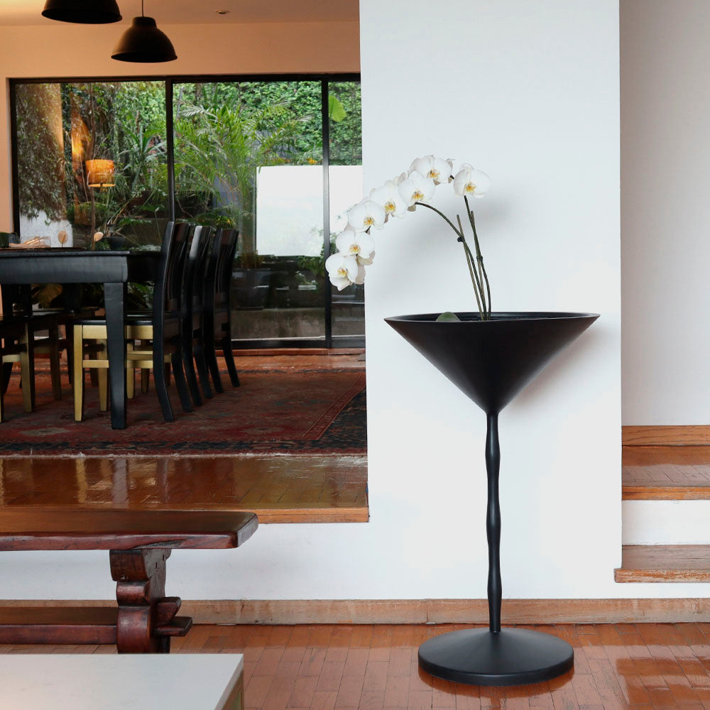Esta maceta Martini con sus distintivas formas, presenta un pedestal y llega a un cono invertido, generando así un espacio ideal para plantas colgantes o para arbustos frondosos.